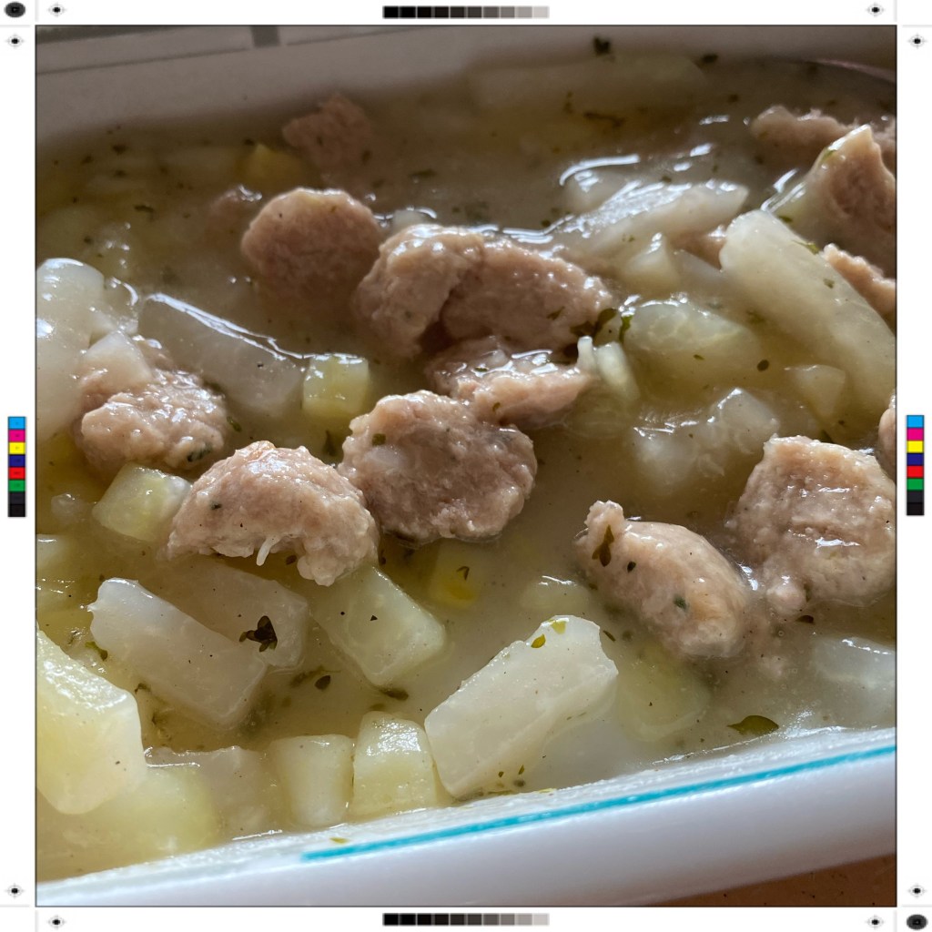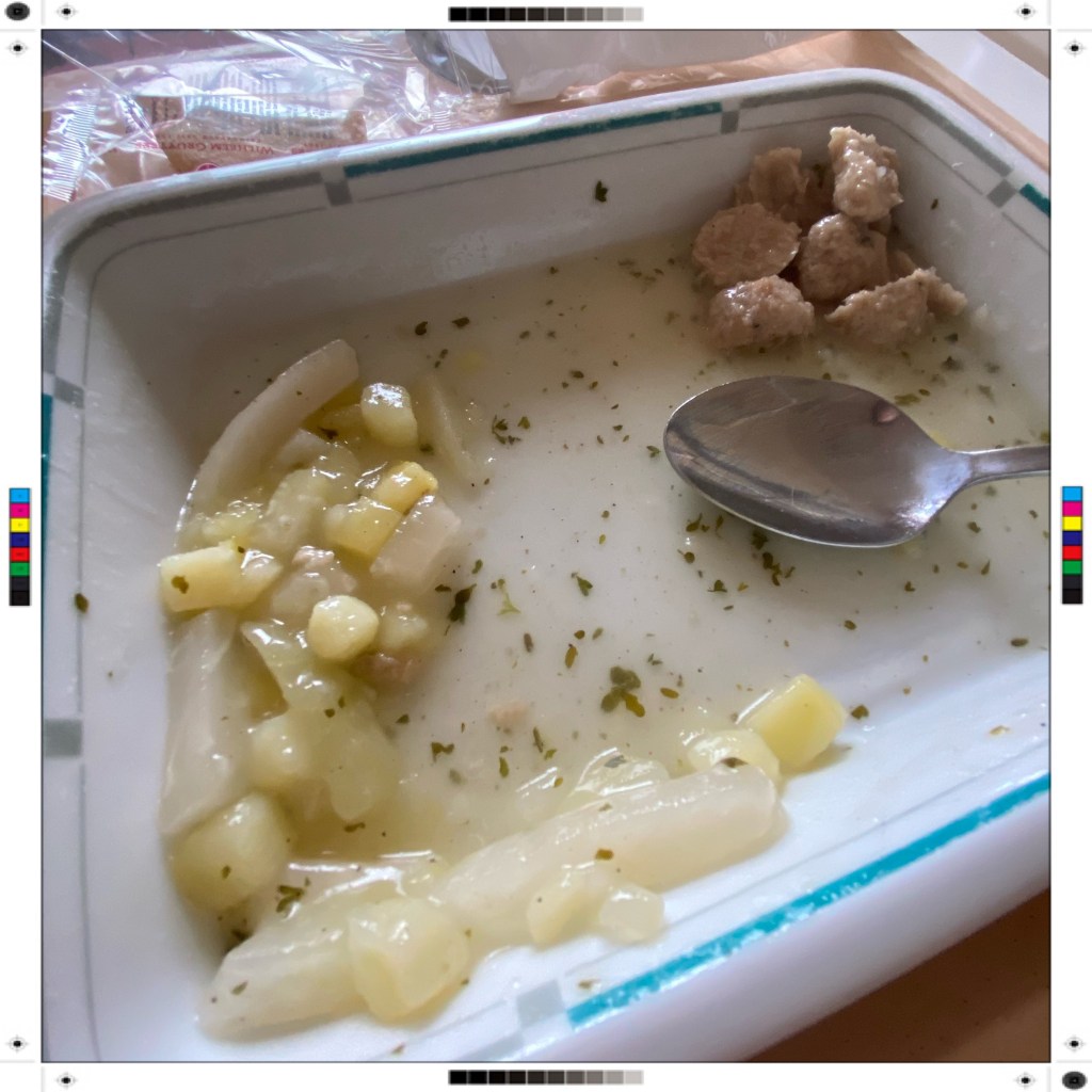 Danach passiert nicht viel nennenswertes bis zum Mittagessen, außer, dass mein Zimmergenosse, der ältere Herr, entlassen und abgeholt wird. Das Mittagsmenü ist heute ein Kohlrabieintopf mit Kartoffelstückchen und Hackklößchen. Dabei kommt der kleine Junge in mir wieder durch. Als erstes teile ich sämtliche Hackbällchen in kleinere, um bei jedem Löffel ein bisschen davon mit auf letzterem zu haben.
