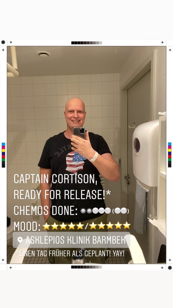 Dann nix wie ab nach Hause. 20 Minuten später klingele ich zuhause und alle sind überrascht und überglücklich. Meine Große ist leider krank und musste heute mit Fieber zuhause bleiben. Sauber! Kann ich direkt austesten, was meine neu gebildeten Leukozyten und Neutrophilen so abkönnen. Wir wollen es uns ja auch nicht zu einfach machen. Als erstes räume ich alle meine Sachen weg. Das ist wichtig für mich, weil es mir symbolisiert, dass Zyklus II nun offiziell in den Büchern ist und ich jetzt erstmal wieder „frei“ habe.