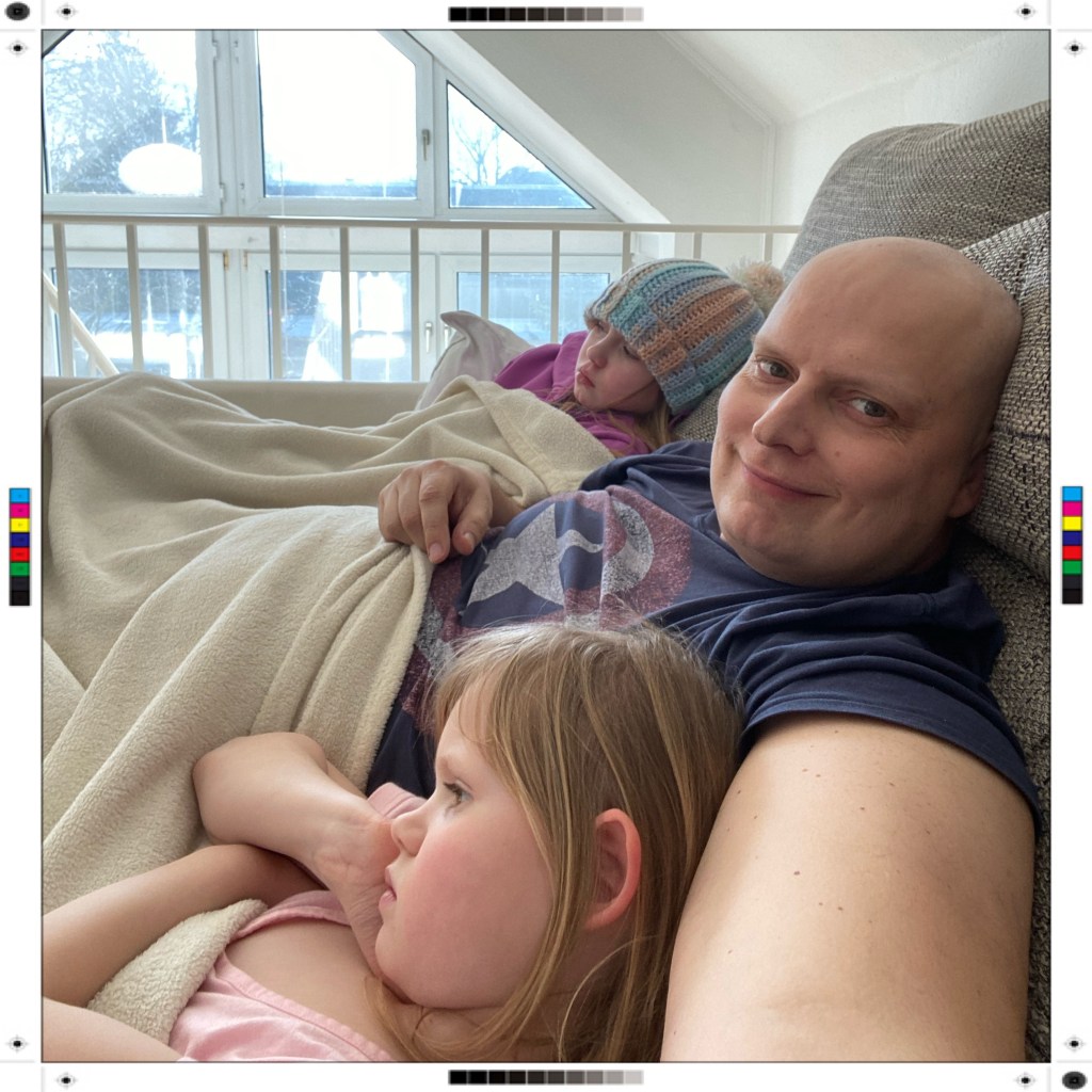 Nach dem Essen ist kuscheln angesagt. Die Große mit Mütze, wegen des Infekts friert sie die ganze Zeit. Wird Zeit, dass der immerwarme Daddy sie wieder warmkuschelt. Ging ja lange genug nicht.