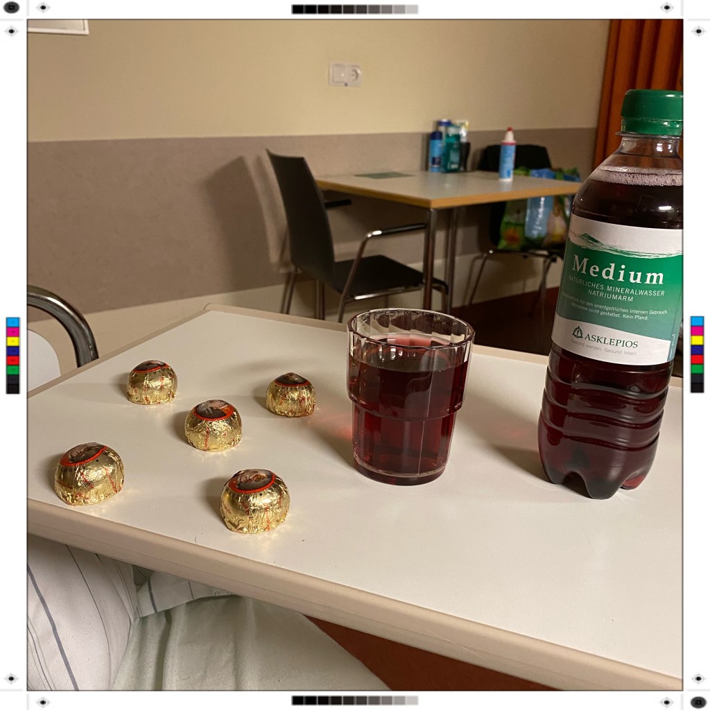 Um 18:30 Uhr gibt es dann wieder ein kleines Abendessen. Dazu gönne ich mir ein paar Gläser Traubensaftschorle – in der Hoffnung dass es vielleicht gut für die Blutbildung ist. Und zum Nachtisch haben mir meine Eltern noch ein paar Mozartkugeln dagelassen. Sie werden den Abend nicht überleben. Genauso wie die mitgebrachte Eichsfelder Stracke und die paar Scheiben Landbrot. Simpel aber lecker!